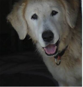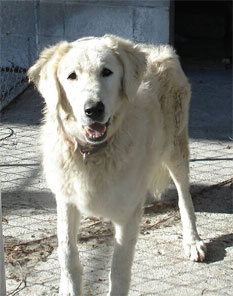 Bertie is the miracle dog. She escaped on day 2 of her time here, and spent 3 months, covering most of the 200 acres here. Amazingly, she has stayed within the surveyed boundaries, on 2 sides of the highway (SHUDDER), came in to eat when everyone left, but only in areas she could escape from. Bertie would bark from a distance if dinner was late. She is VERY smart and very savvy. She demonstrated what we'd expect from a working Kuvasz entirely on her own, having been raised as a kennel dog. Besides intuitively understanding the boundaries of "the farm", she gathered and protected a small herd of deer (or they did her) and lived very well by her wits!!!!. Then she decided it was time to come back to the group as winter set in. Bertie is very happy and attached here and not available for adoption.