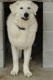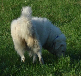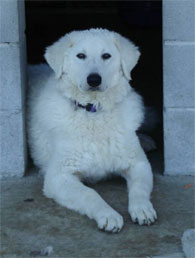 NOW he's a charming, frolicking fellow! He would be perfect for someone who is not looking for a completely SERIOUS Kuvasz. Poppie would probably fine with other dogs and cats, if he is handled intelligently and given the opportunity to adjust. He takes the lead as "watcher" at night when Travis goes off duty. Poppie is not yet great on a leash, but he's learning! He is VERY fond of toys, and attention. He's quite BOUNCY, turns "inside out" giving happy attention at the least provocation! Poppie is just a lovely dog!