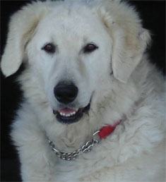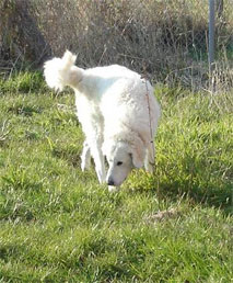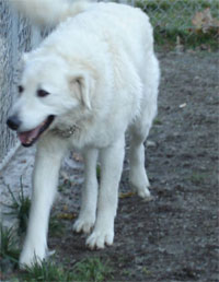 "Tristram Shandy" (couldn't resist the literary mention) is a BIG, but solidly-lean neutered male, with a mind of his own. However, he is also very affectionate. The bigger the dog, the bigger the baby...with a tendency to whine and cry for attention when its not "his turn," which really isn't becoming to his general look! He has a quiet reserve as well (which sounds contradictory, but you have to see him.) He is probably the most "his own dog" of all of them while still seeking affection and attention. Shandy keys off Duchess at the moment in an adjoining run, and can be quite agressive through the fence with strangers (that's almost a Kuvasz trait isn't it?) But, he takes direction/verbal correction well. Shandy meets strangers on leash politely. He loves food, cookies and his BED!!!! Shandy would do very well in a home environment with folks who love long walks on a leash. He enjoys running free, but quickly circles back for attention and cuddling. Shandy is not a dog that would do well in a competitive environment with other males and probably would resent being left alone all day. There's more to Shandy than he's shown yet. He would be better in a one dog home, or definitely as the only male.
